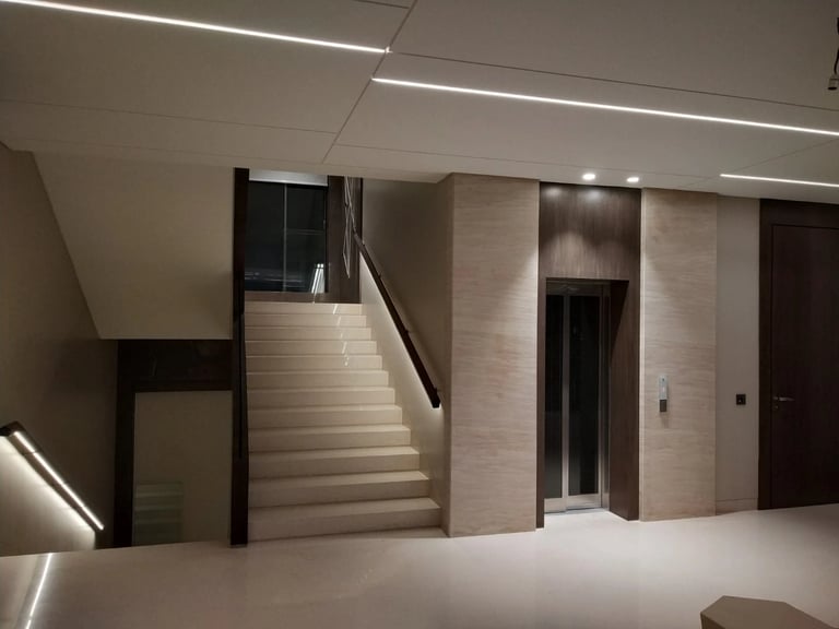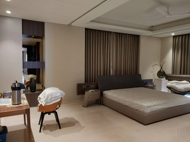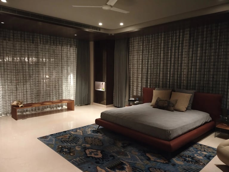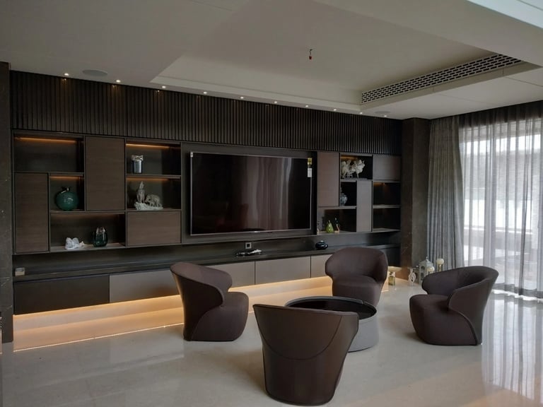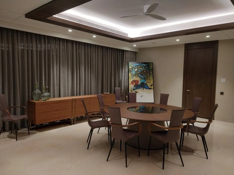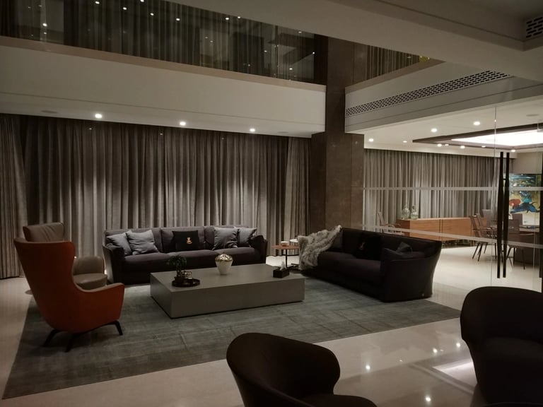 The expansive 3,500 square feet of interior space is masterfully designed for an elite clientele, where sophistication meets comfort. The soft beige flooring and wall panels provide a serene backdrop, allowing the rich, dark colors of the luxurious furniture to stand out and create a striking contrast. Carefully curated lighting enhances the ambiance, casting gentle shadows that define and elevate different areas of the room, making each corner feel unique and inviting. Thoughtful arrangements and textures throughout the space promote both elegance and functionality, ensuring that every moment spent here is an experience of refined living. This harmonious blend of elements not only reflects a high standard of taste but also creates a warm and welcoming environment for entertaining and relaxation.